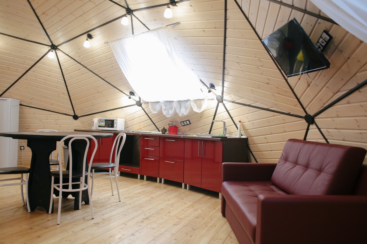 Кухня: кухонный гарнитур, холодильник, печь, микроволновая печь, обеденный стол, стулья, посуда для приготовления и сервировки.